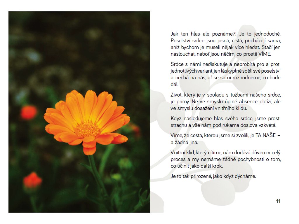 Poznejte knihu, která odnáší staré, aby mohlo přijít nové. Pohladí na duši každého, kdo chce naslouchat nejen své mysli, ale i své duši a svému srdci. Pomůže vám učinit první krok do neznáma, i když teď máte pocit, že si s ním vůbec nevíte rady. Poskytne vám inspiraci, jak vystoupit z vlastního stínu a vydat se odvážně, s náručí plnou neděje, svojí osobitou životní cestou. V celém procesu vaší proměny vám bude přítelem a průvodcem, který ve vás vždy rozdmýchá odvahu kráčet cestou svého srdce a překonat nelehké období změn. Nechte promlouvat svoji duši a naučte se jí naslouchat. Klíč k otevření svého svobodného a naplněného života máte právě teď ve svých rukách, tak se ho pojďme společně naučit používat.
