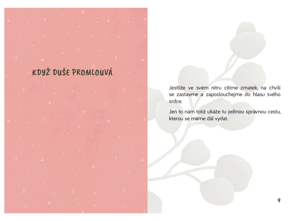 - Když duše promlouvá - kniha, která stála na samém počátku všeho dalšího dění. Ta, která odnáší staré, aby mohlo přijít nové. Taková, která pohladí na duši každého, kdo chce naslouchat nejen své mysli, ale i své duši a svému srdci a učinit první krok do neznáma. Je to průvodce plný inspirace a přítel, který ukáže, jak vystoupit z vlastního stínu a vydat se odvážně, s náručí plnou neděje, svojí osobitou životní cestou.