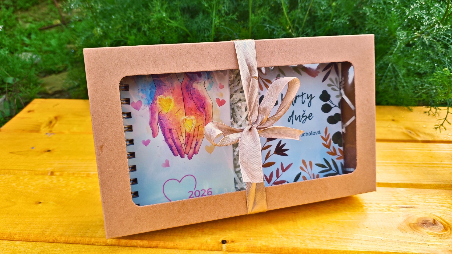Součástí dárkového balíčku je autorský diář SRDCE NA DLANI ve velikosti A6 a Karty duše.
