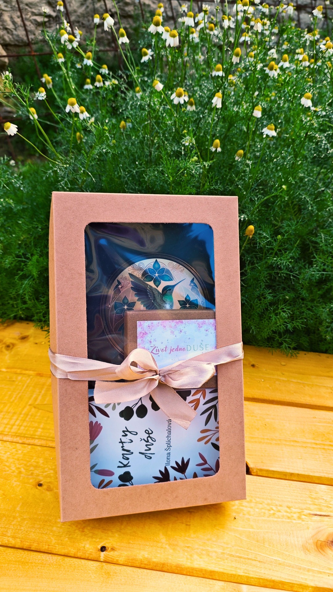 Součástí dárkového balíčku je autorský diář KOLIBŘÍK ve velikosti A5 a Karty duše a kartičky Život jednoDUŠE.